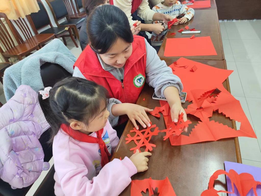活动伊始,实践队员先给社区居民详细介绍了剪纸文化的历史、样式和分类,并讲授了减值的基本方法和技巧。随后,社区的小朋友与家长们纷纷跃跃欲试,在掌握了“折、画、剪”的小窍门之后,便开始了艺术创作。时而认真思考,时而上下摆弄,智慧在指尖流转,创意在纸端跳跃。居民们左一剪右一剪,不一会的功夫,平凡的纸张在指尖焕发出了别样的风采,一张张红色的剪纸作品映入眼帘。