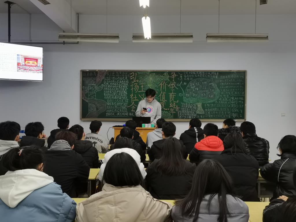 在本次主题团课上由各班团支书带领同学们回顾了社会主义核心价值观内容,并向大家解读国家层面,社会层面,个人层面的要义。期间团支书告诉同学们“这二十四个字回答了我们要建设什么样的国家、建设什么样的社会、培育什么样的公民的重大问题。”最后团支书告诉大家“树立科学的精神,不断加强业务学习,可以通过参加各类志愿服务工作等平台,努力实现自身的价值。”