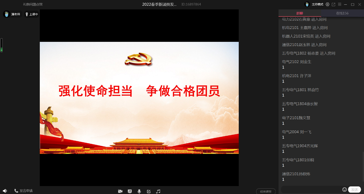本次团课上,潘灿灿老师带领大家学习了习近平总书记关于青年成长的相关重要论述,强调作为新时代的青年,应志存高远、忠于祖国,努力做新时代具有远大理想和坚定信念的爱国者,应敢于担当、勇于奋斗,努力做新时代具有责任意识和创新精神的建设者,应勤奋学习、锤炼身心,努力做新时代具有过硬本领和高尚品格的接班人,要始终保持积极向上的精神状态,努力做到不变化、不颓废、不动摇、不退缩,做维护人民利益的忠实践行者。同学们表示,一定会时刻严格要求自己,将个人理想的实现融入中华民族伟大复兴之路当中。