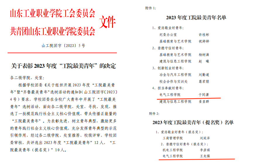 近日,公司团委下发了《关于表彰2023年度“工院最美青年”的决定》,公司员工于同潇获得“担当奉献好青年”、王龙强获得“崇德守信好青年(提名奖)”称号。