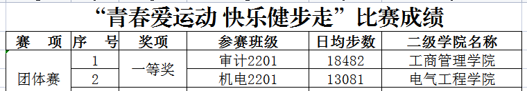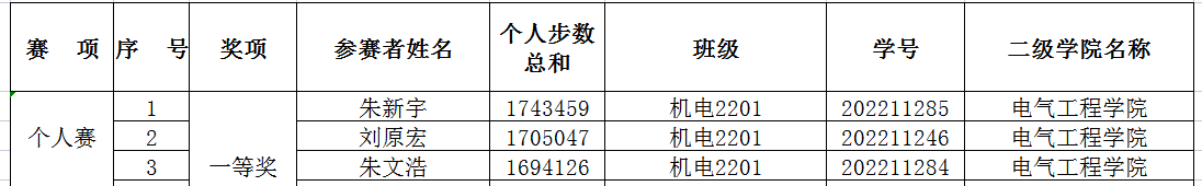 近日,由公司团委、员工工作处主办的“青春爱运动 快乐健步走”活动圆满结束,公司机电2201班获得团体赛一等奖,朱新宇、刘原宏、朱文浩获得个人赛一等奖。