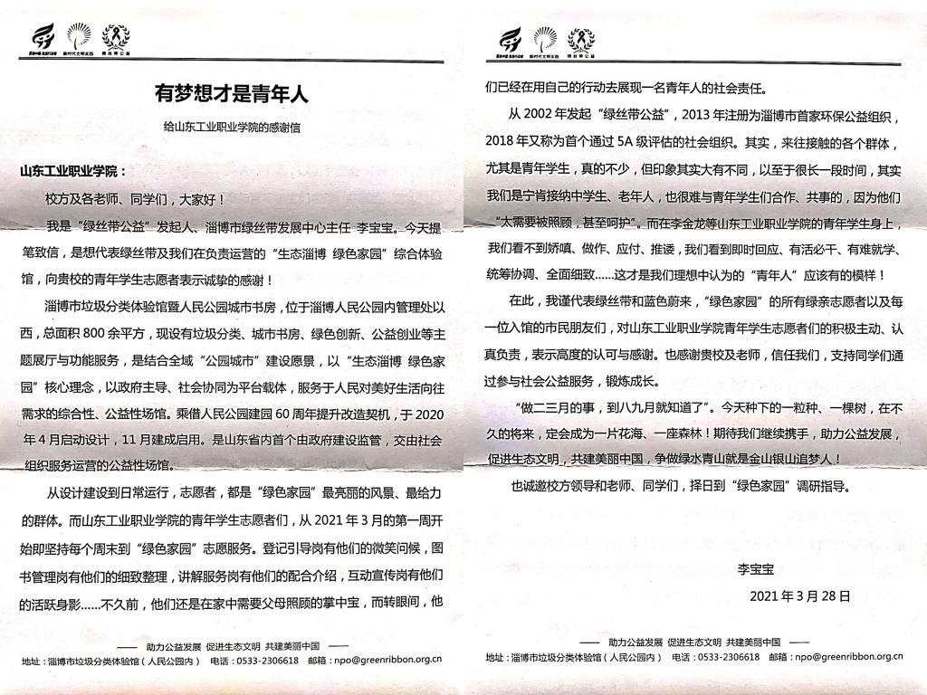 2021年3月28日公司“追梦志愿服务队”收到来自“绿丝带公益”发起人李宝宝老师的感谢信。发来的感谢信,是“绿丝带公益”对公司志愿者团队工作的反馈,更是“绿丝带公益”对我们工作的肯定。