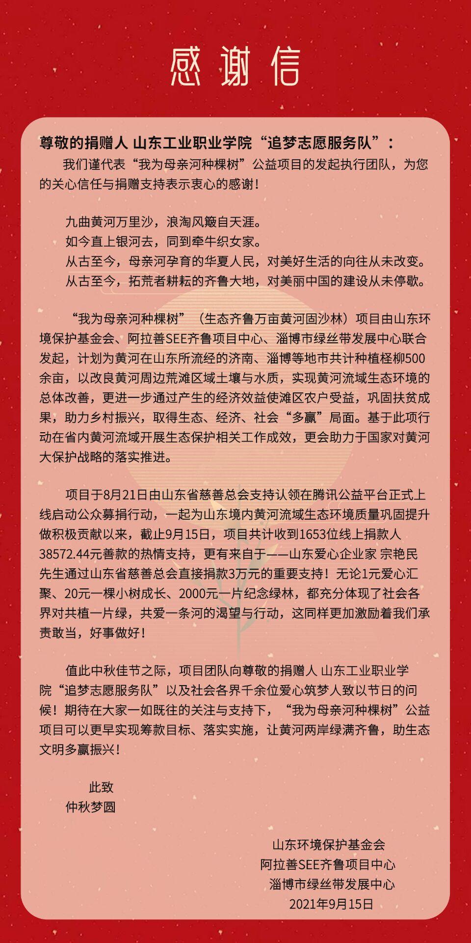 月满中秋,值此中秋佳节之际,山东环境保护基金会、阿拉善SEE齐鲁项目中心,淄博市绿丝带发展中心“我为母亲河种棵树”公益项目联合团队为伟德体育“追梦志愿服务队”写来感谢信,信中提到:“期待在大家一如既往的关注与支持下,‘我为母亲河种棵树’公益项目可以早日实现筹集目标,落实实施,让黄河两岸绿满齐鲁,助力生态文明多振兴。”