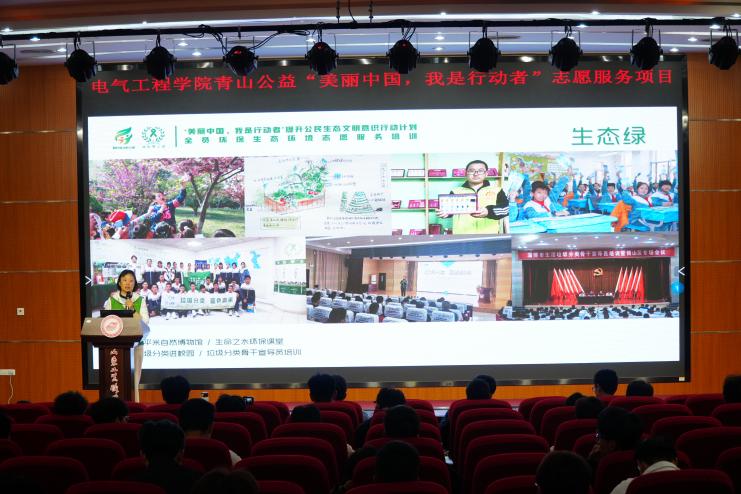 现场邀请资深环保公益讲师淄博市绿丝带发展中心李宝宝主任以《做好垃圾分类,助力生态文明美丽中国》为主题进行“美丽中国,我是行动者”生态文明主题宣讲,以通俗易懂的语言解读了二十大报告中的生态环境保护要求,通过多个生动丰富的案例分享了垃圾分类、生态环境志愿服务的意义和实践内容。现场还邀请到淄博市蓝色蔚来社会创新发展中心杨忠凯主任为师生们介绍分享了《让技术工艺为古树名木做创新守护》生态文明实践案例,展示了如何通过运用互联网思维与技术创新为古树保护提供全新范例,更好地传承中华文明,传递美丽乡愁,希望更多人成为古树守护人。
