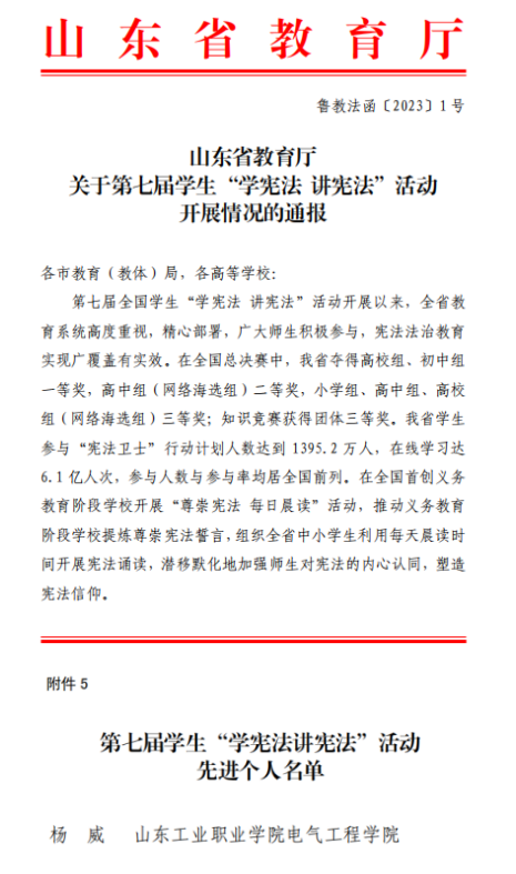 近日,山东省教育厅下发《关于第七届员工“学宪法 讲宪法”活动开展情况的通报》,公司杨威被评为“第七届员工‘学宪法讲宪法’活动先进个人”。