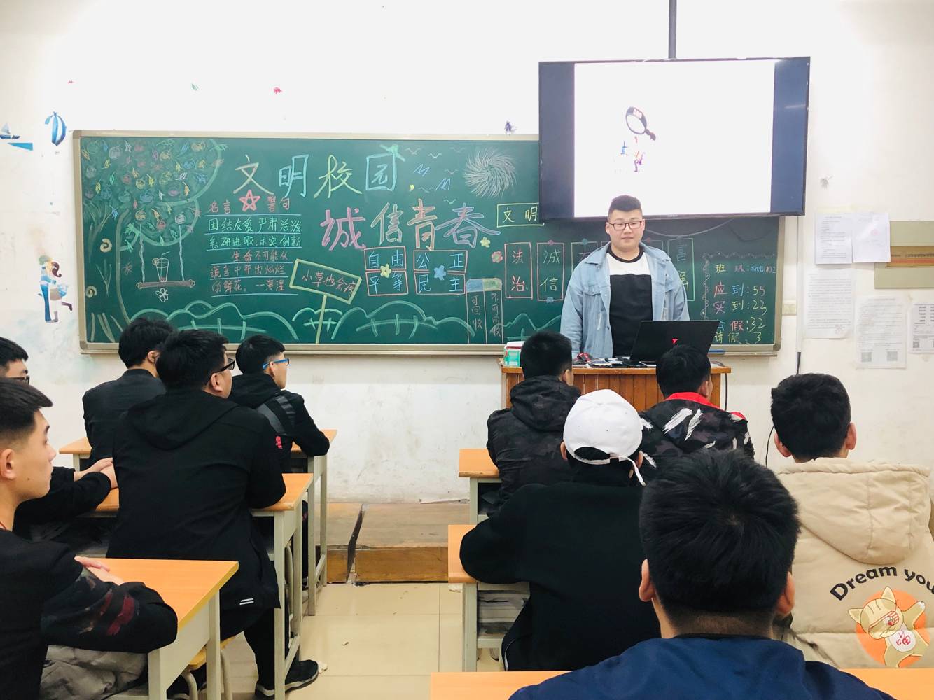 为提高同学们的诚信意识,增强同学们的责任感,4月9日晚自习时间,我系员工会组织部组织各班开展了以“文明校园,诚信青春”为主题的团课。
