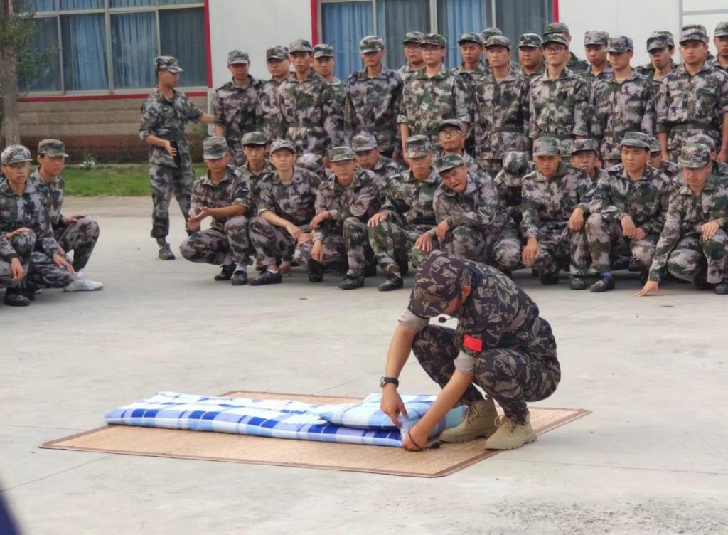 清晨,新生们身着整齐的军装,从站军姿、稍息、立正、跨立、停止间转法,叠“豆腐块”等基本项目开始学起。每一个动作,都由每一位教官亲自分解示范与指导,从摆臂到踢腿,从握拳到绷脚,都由教官严格把关。教官们有力的命令声响彻操场,同学们响亮的口号声振奋着公司新生的士气。