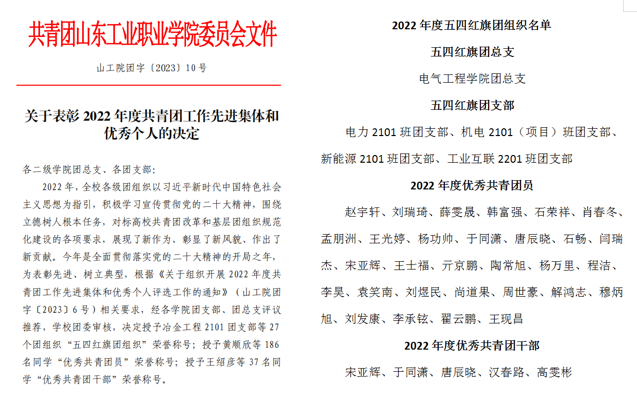 2023年4月28日,公司团委公布《关于表彰2022年度共青团工作先进集体和优秀个人的决定》,Bevictor伟德团总支被评为“五四红旗团总支”,电力2101班团支部等4个团支部被评为“五四红旗团支部”,赵宇轩等30名同学被评为“优秀团员”,宋亚辉等5名同学被评为“优秀团干部”。