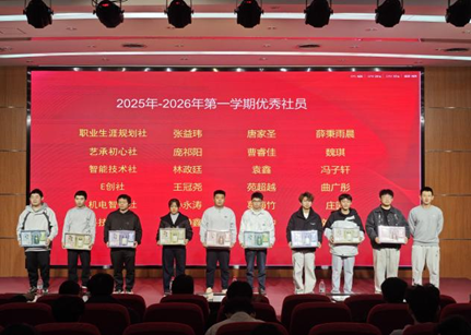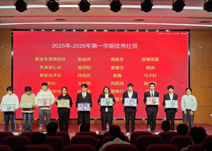 活动现场还举行了表彰仪式,公布了2024-2025学年第二学期优秀社团,2025-2026学年第一学期优秀社员名单。公司团总支书记杨慧老师为获奖集体和个人送上祝贺,肯定了各社团的丰硕成果,鼓励同学们继续在社团平台中锤炼本领、追逐热爱,在青春舞台上绽放更多光彩。