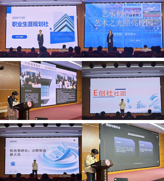 活动开场,老员工艺术团街舞社的动感舞蹈瞬间点燃全场氛围。“社团风采大赏”环节精彩纷呈,6大社团各展所长、亮点纷呈。职业生涯规划社清晰了呈现职业发展探索路径,社员演唱的《有些》传递出对未来的憧憬;艺承初心社以“坚守初心”为理念,并演绎了舞蹈《燕无歇》将艺术之美诠释得淋漓尽致;智能技术社现场展示“触摸按键燃气控制器”等智能成果,细致讲解使用方法,让大家直观感受科技魅力;E创社分享创业经历与项目案例,演唱了《你听得到》诉说着创新创业路上的坚持;机电智研社展示科研实践成果,朗诵的《沁园春·雪》气势豪迈,赢得阵阵掌声;科技兴趣社的趣味提问与成果展示,成功激发了同学们的科技探索热情。