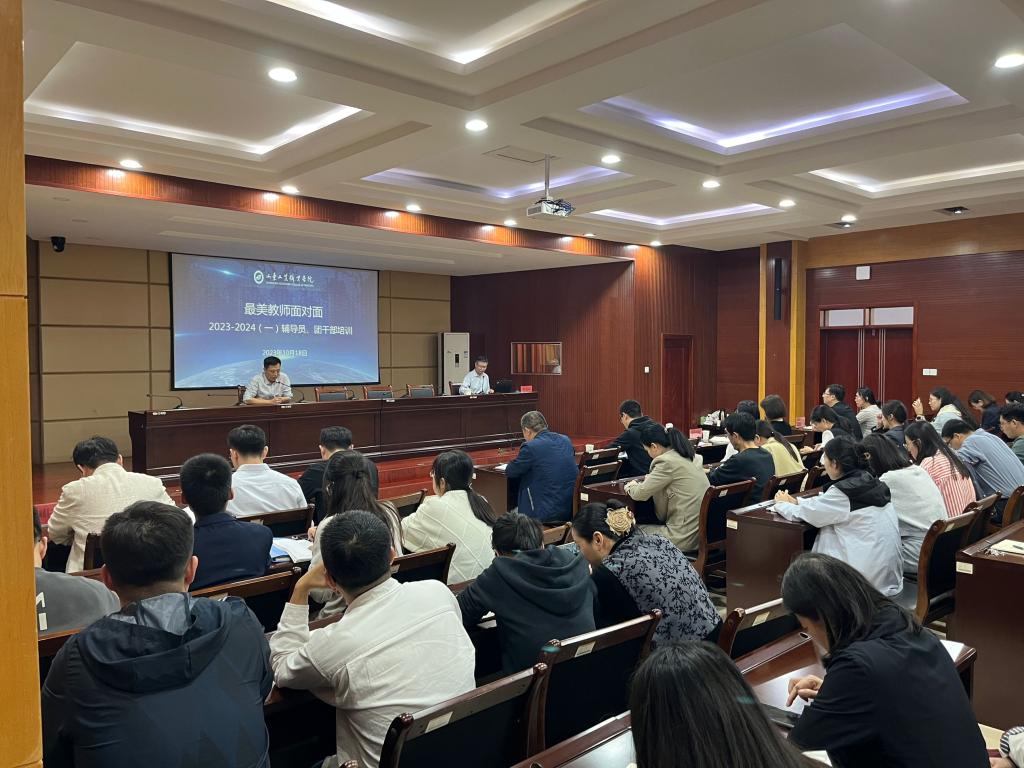 本次活动主讲人、2023年“齐鲁最美教师”牛同训教授,以“立足岗位、追求卓越”为题,从个人的工作情况、对职业教育的认识、寄语青年辅导员等三个方面,给全体辅导员(团干部)做了一场生动的报告。